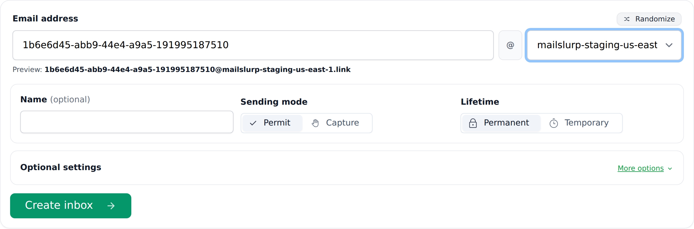 To use your domain with inboxes navigate to the inbox creation page and select the custom domain option. You can then select the domain you want to use from the dropdown and add a local address part as a prefix.
