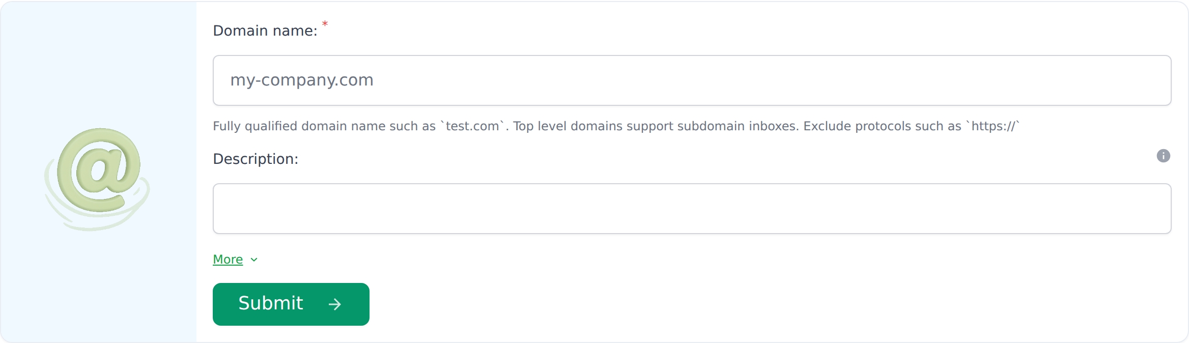 Custom domains allow your to create email addresses on your own domain name (such as my-address@my-site.com). This is useful for testing and production applications and is highly recommended when sending emails to real customers. Using a custom domain rate improves deliverability and reduces the chance of emails being marked as spam.