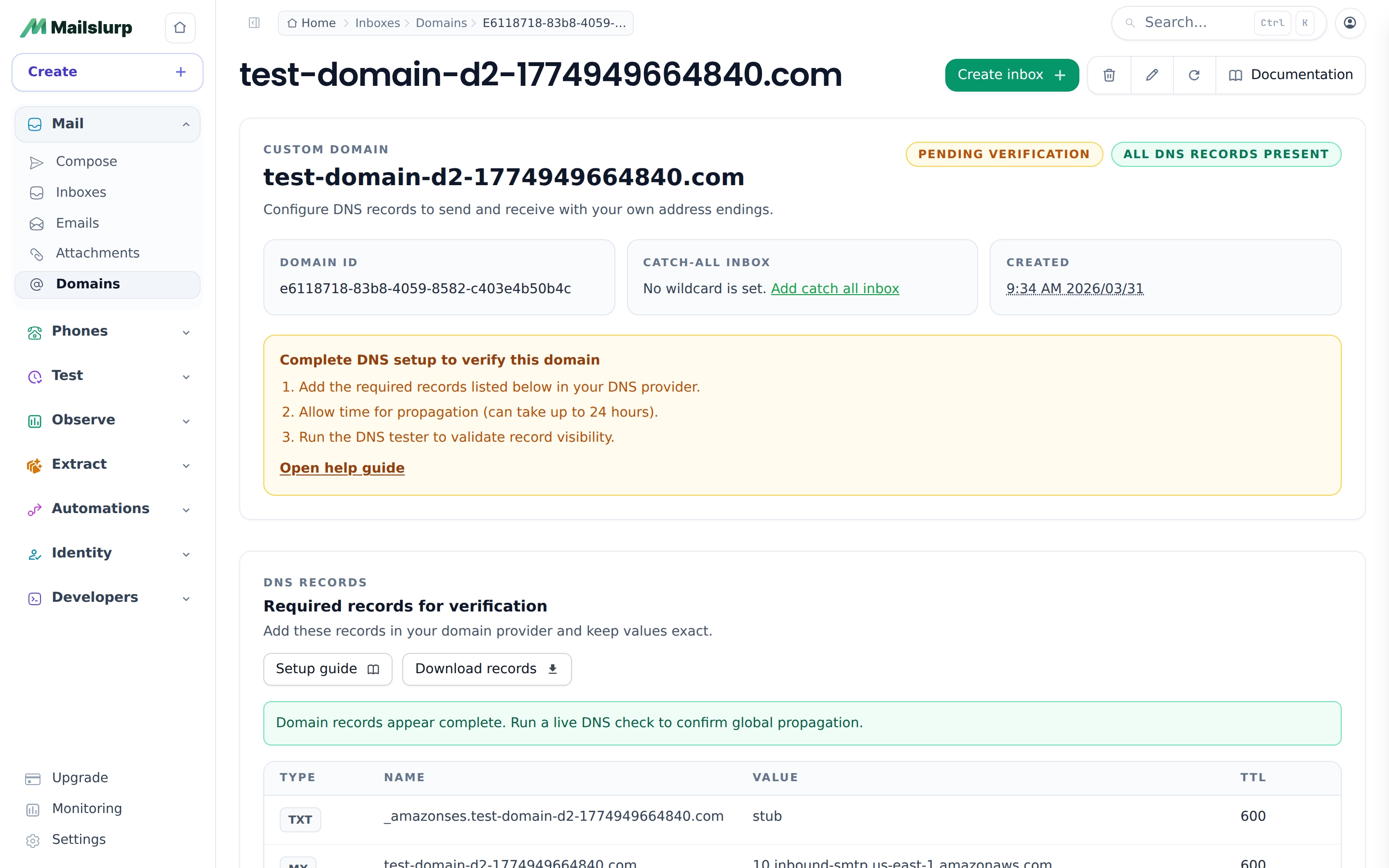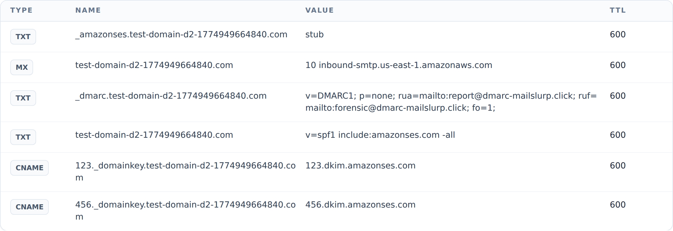 To use your domain with MailSlurp you must verify ownership. This is done by adding a DNS record to your domain. The DNS records must all be added exactly as shown on the domain page.